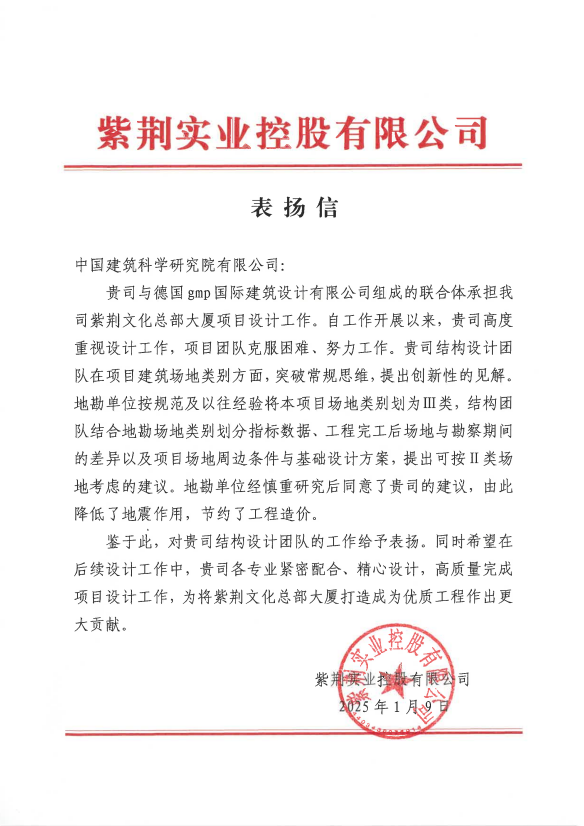 1月9日,中國建研院深圳分公司收到紫荊實(shí)業(yè)控股有限公司發(fā)來的表揚(yáng)信,對(duì)中國建研院深圳分公司紫荊文化總部大廈項(xiàng)目設(shè)計(jì)團(tuán)隊(duì)的工作給予充分肯定。