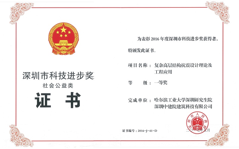 2017年 9月21日下午,深圳召開全市科學技術獎勵大會,市長陳如桂主持大會,省委常委、市委書記王偉中出席大會并講話,副市長艾學峰通報全市創新驅動發展情況,并宣讀關于頒發2016年度深圳市科學技術獎的通報。其中,以哈爾濱工業大學(下稱哈工大)滕軍教授和我院深圳中建院建筑科技有限公司(下稱中建院)何春凱研究員等作為主要參與人,哈工大和中建院共同完成的課題《復雜高層結構抗震設計理論及工程應用》榮獲2016年度深圳市科技進步獎一等獎。