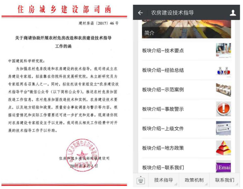 為配合專家組工作的開展,受住房和城鄉(xiāng)建設(shè)部村鎮(zhèn)建設(shè)司委托,依托專家組設(shè)立“農(nóng)房建設(shè)技術(shù)指導(dǎo)”微信公眾號(hào),致力于農(nóng)房建設(shè)知識(shí)普及化、技術(shù)指導(dǎo)精準(zhǔn)化,搭建上下互通,技術(shù)指導(dǎo)與示范建設(shè)協(xié)調(diào)并進(jìn)的平臺(tái)。微信公眾號(hào)由住房和城鄉(xiāng)建設(shè)部村鎮(zhèn)建設(shè)司主導(dǎo),我院科技發(fā)展研究院負(fù)責(zé)日常運(yùn)營和管理,各地方村鎮(zhèn)建設(shè)管理部門和技術(shù)指導(dǎo)專家定期或不定期上傳相關(guān)信息,配合和支持公眾號(hào)的運(yùn)營。