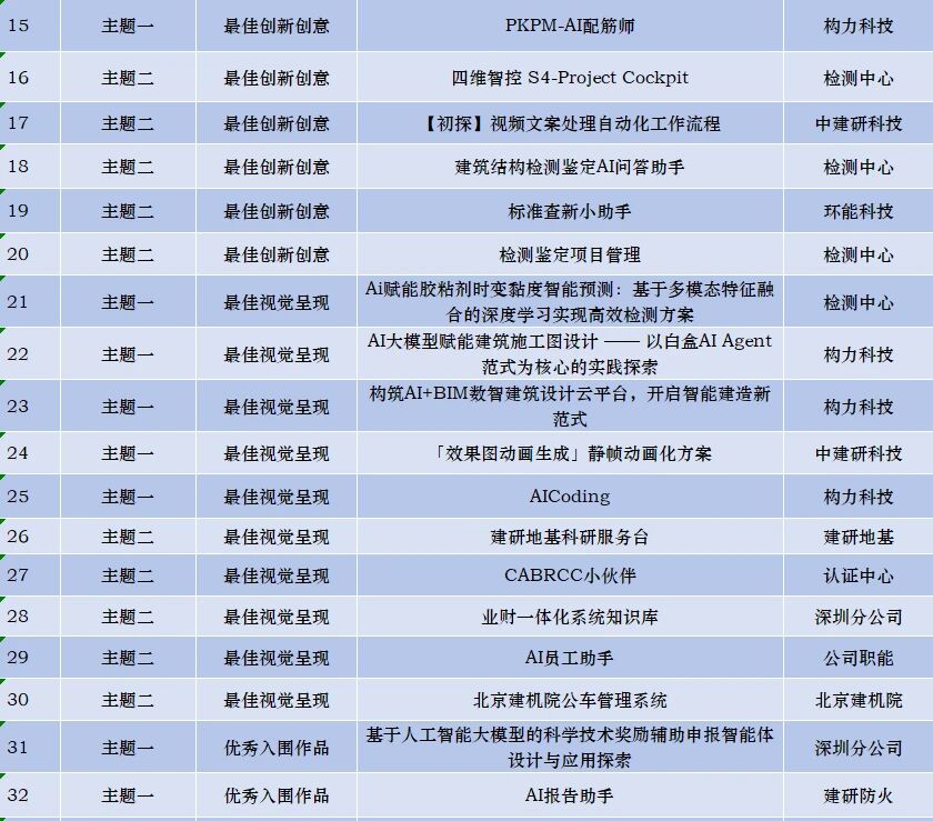 ?首屆“建研青創杯”AI實踐大賽自3月初啟動以來,共500余名職工報名參賽,收集到71組AI實踐案例,其中主題一(挖掘AI應用場景)38組、主題二(打造企業級智能體)33組,案例整體質量高、突顯行業特色、解決實際問題。 經專家評審組打分和大眾評委投票,結合綜合評分、專項評分,按排名篩選出最佳實踐應用、最佳創新創意、最佳視覺呈現、優秀入圍作品等40組獲獎組。 大賽期間,中國建研院團委和數字化管理部還圍繞AI通識教育、AI技術應用、企業級智能體打造等主題累計開展培訓9場,線上線下參與近600人次,活動受到廣大干部職工的廣泛關注和熱情參與。深圳分公司兩個作品“業財一體化系統知識庫”、“基于人工智能大模型的科學技術獎勵輔助申報智能體設計與應用探索”成功入圍,分別獲得最佳視覺呈現獎、優秀入圍作品獎。